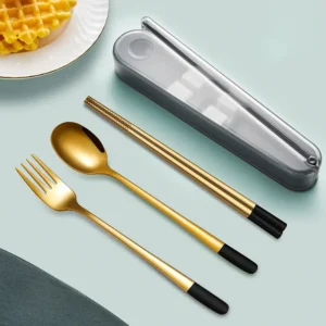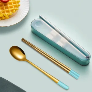 ชุดช้อนส้อมส้อมตะเกียบ วัสดุสแตนเลส คุณภาพดี บรรจุในกล่องพลาสติกขนาดกะทัดรัด พกพาง่าย พร้อมสกรีนโลโก้