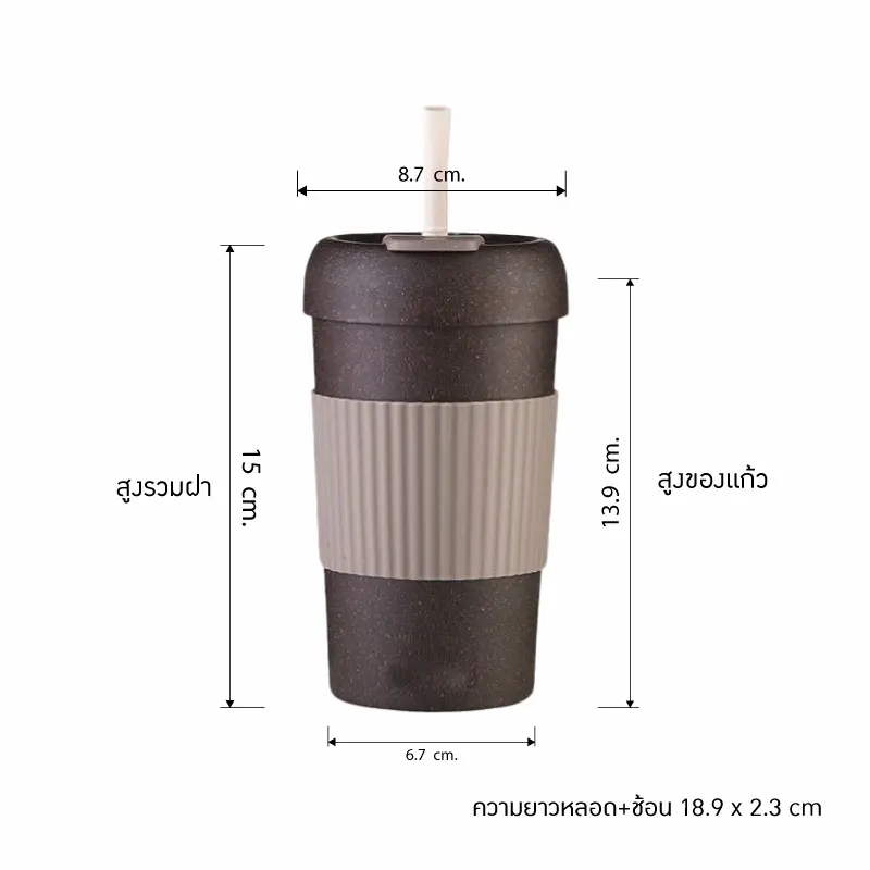 ตัวแก้วมาพร้อมปลอกสวมแก้วกันความร้อน ตัวแก้วสามารถยกดื่มได้ มียางรองก้นแก้ว หลอดดูด+ช้อนคน ในตัว