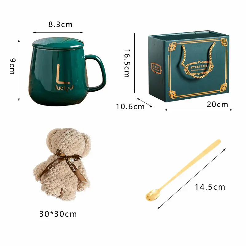 ขนาด : Cup: 9 x 8.3 cm. / ช้อน: 14.5 cm. / ผ้าขนหนู: 30 x 30 cm.